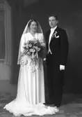 Porträtt av Eva Gyllenstierna (född Svinilson) i brudklänning. Brölloppet stod i Solna kyrka oktober 1936. Brudgum var Ebbe Gyllenstierna.