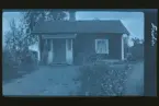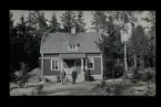 "Skoga, Valfrid Eriksson, Alvar o Ingrid." En familj framför sitt hus.