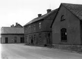 Skara. Axvallatullen (Götalatullen), Apells Tunnbinderi. Teglaskolan till höger över taken, april 1964. Ingenjör Ernst Lefvanders samling, Skara.