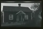 "Alfred Öström, skogvaktare." En man sitter på farstubron till sitt/ett hus.