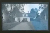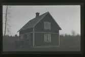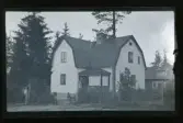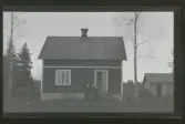 "Skoga, Valfrid Eriksson, Alvar o Ingrid." En familj framför sitt hus.