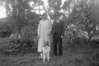 Sannolikt Josef Ärnström med två kvinnor framför ett bostadshus