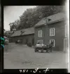 Folkdräktsklädda människor. Hästskjuts vid gård. Grindöppning.