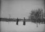 "Agda och Anny på skidor I. 1915. Av R. L." Två kvinnor åker skidor i vinterlandskap.