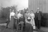 En kvinna och en man sitter i en soffa av gustaviansk stil med två barn. Det är familjen Andersson i Alboga. Ester och Olle med barnen Ingeborg och Karl Erik i knät.
