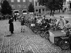 Ungdomar som deltar i en studiedag anordnad av Hushållningssällskapet och en kommitté för kvinnlig samhällstjänst studerar smörkärnan vid Mjölkcentralen, Storgatan 19