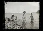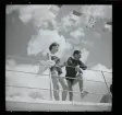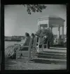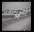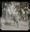 En kvinna står vid en ihålig ek och blir fotograferad av en man.