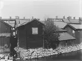 Gården Siken i Onsala. Bostadshus och ekonomibyggnader kring en stenlagd gårdsplan, där en kvinna och ett litet barn befinner sig. Vällingklockan sitter fortfarande kvar på gavelnocken bortanför mangårdsbyggnaden. Sådana användes före urens tid på större gårdar för att signalera arbetsdagens början och slut eller samla gårdsfolket. Under 1890-talet ägdes gården av James Dickson och det var här han först anlade stuterei samt rid- och körskola innan han flyttade verksamheten till Tjolöholm på andra sidan Kungsbackafjorden. (Se även bild nr VMA8653_45a)