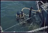 Dykare får upp en skulptur från Vasa på dykarflotten.