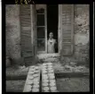 Ett målat fat vilar mot en stol som står ute i en trädgård. Fatet förevisas av en man, endast hans ena hand syns i bild. En pojke kymtar i bildens högra kant.