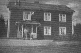 Liten innergård med träd på fastigheten i hörnet Östra Långgatan-Norrgatan, kv Postmästaren. På balkongen står Ruth Hammarqvist, Hanna Hammarqvist och Anna Hammarqvist med en tjänsteflicka.