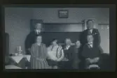 Rumsinteriör. Familj 6 personer vid orgeln, far spelar fiol. J.A. Boo