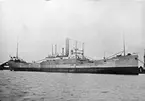 Akvarell visande babordsidan i dess helhet. Three-island skrov, svart med vit överbyggnad. Svart skorsten med vit ring. Sign. H. Crane