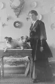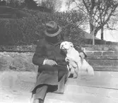 "Carl med Daisi - före" (underförstått: hundens nedkomst). Carl Sparre fotograferad med hunden bredvid sig på trappan upp till östra parterren.