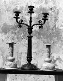 Vas, blomskål och ljusstake från Bo Fajans, formgivare Ewald Dahlskog, tidigt 1900-tal. Fotografiet är märkt med fotografens signatur i blyerts.