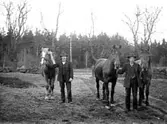 EN MAN HÅLLER TVÅ HÄSTAR I BETESHAGEN.