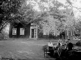 TRE KVINNOR OCH EN MAN FRAMFÖR ETT BOSTADSHUS SANNOLIKT MOR MED TRE VUXNA BARN.