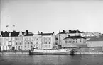 Byggnader längs Nyhavn, Köpenhamn. På fasaderna skyltas för Ritzau, Cunard linien och D.F. Schnack vinhandel.