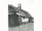 "Bålastuga med halmtak." I mitten skjuter ett putsat väggparti ut, troligen bakugn. Bålastugor (jfr gotländska "bulhus") byggdes med skiftesverksteknik. Denna har panelfasad.