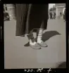 Tangoskor. Ett par damskor i ljusbrun mocka med hög klack, öppen tå och svart vristrem samt ett par högklackade damskor, vita med svart tå och vristrem.