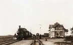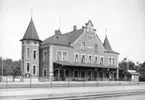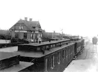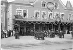 L.S.S.J. (Lidköping-Skara-Stenstorps Jernväg). Skara station år 1902. En del av personalen är kända: från höger Gustav Kjellberg, O. Ryberg, Oscar Sandh, okänd, Ludvig Dahlén, Frans Svensson, G. Stern, Gustaf Ahlberg och konduktören K. Karlsson. Övriga okända.