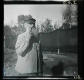 Kembels slutar, Blå stjärnan, 8 juli 1967 En man sitter vid ett bord med en bricka framför sig. Han är klädd i en kortärmad T-tröja. En bricka står framför honom på bordet. På denna står en tallrik, bestick, en uppläggningsfat i metall med två potatisar i, en assiett, salt, peppar och ett glas. En påse tobak ligger också på bordet. En annan bricka står brevid mannen på ett annat bord till vänster.