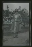 Porträtt av en kvinna ståendes utomhus, klädd i kappa och med ett paraply i ena handen. "Brita Holmstrand, mejerinna Fogelstad."