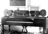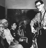 Auktionskammaren, 6 maj 1965 En man provar på ett musikinstrument på auktion.