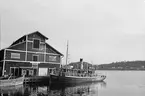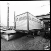 Förman Lennart Pettersson och tjänsteman Karl-Arvid Nilsson framför ett lagerhus vid AB Järnförädling i Hälleforsnäs.