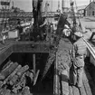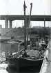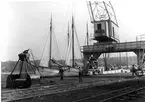 Vedskutor lossar vid Strandvägskajen, Stockholm. Seglen torkas efter ett regnväder.
