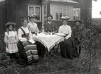 Enligt fotografens noteringar: "Grupp på verandan." Plats: Kasen Datum: 1 Juni 1900 Tid: Kl 7.10 fm. Ljus: Solsken svagt Bländare: No 1 Objektiv: Svenska Express Exponering: Hastighet nr. 3 Framkallning: Hydroekinon -Eikonogen