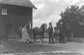 Åsmundshyttan. Hästarna Flora och Jonas vattnas efter dagens arbete av stalldrängarna Joel Hansson och Arnold Jönsson. Bilden finns med i Torsåkers Fotohistoriska Sällskap. Bild 5:10.