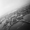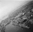 Varvet Fiat-San Giorgio i La Spezia. Skrovhallsbyggnaden sett från provturskajen. Ubåten HVALEN i förgrunden.