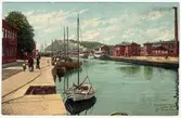 Tryckt text på vykortets framsida: "Parti vid träbron Uddevalla."