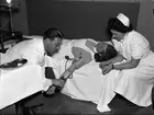 "Personalen på Ulleråker lämnar blod till armén" - läkaren Evert Ljungberg och sjuksköterskan Karin Bengtsson under en blodtappning, Ulleråkers sjukhus, Uppsala oktober 1941