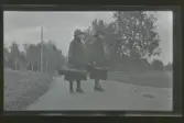 "Svea Forsman, Gertrud Lundberg Dalhem, Norrtorp." Två kvinnor på en landsväg. Båda håller fiolfodral och blickar mot fjärran.