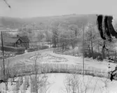 Vy från Krokshallsberget åt sydväst med Dalhem i mellanplanet t.v. och Borås-Mekaniska-Verkstad t.h. år 1927.