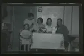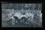 "Heding Floda vänträff." Ett sällskap sitter utomhus kring ett bord dukat med kaffekoppar. I mitten sitter Frida och Axel Fredriksson.