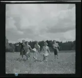 568 F. Stieg Trenter, Torremolinos. Ett sällskap umgås i en soffgruppav rotting, framför en öppen spis.