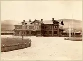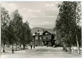 'Från Professor Leonard Axel Jägerskiölds ripjakter vid Fjällåsen. :: :: 2 män, och längre fram 2 kvinnor, samt ytterligare längre fram fler personer gåendes på en grusväg i Gällivare. Med på bilden finns även gärdsgårdar, trähägnad, staket, diverse byggnader, hus och en kyrka. :: :: Ingår i serie med fotonr. 4312:1-38.'