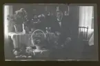 "Dammkärr, Kristina o August Karlsson Ingrid, Stina." Porträtt av en familj vid ett bord med gratulations-blommor.