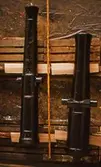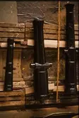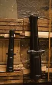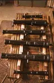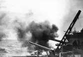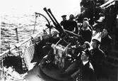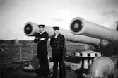 Fyra män sittande på de förliga 28 cm kanonerna på ett pansarskepp av Sverige-klassen.