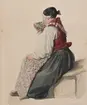 "Kvinna i kyrkodrägt, Ljusdahl 1840". Akvarell av J.W Wallander. Kvinna i helfigur,från sidan, sittande på en bänk.
