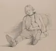"Bonde från Bosarp" Man i helfigur i dräkt sittande sovandes mot en vägg. Blyertsteckning i storformat av Otto Wallgren.