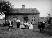 FAMILJ FRAMFÖR SITT TIMRADE BOSTADSHUS. EN KO BETAR VID STUGKNUTEN.