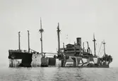 Foto av ångfartyg förankrat i stilla vatten. Signalflaggor hissade över topparna.