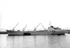 Det engelska lastmotrorfartyget ATHELPRINCE av Liverpool förlänges vid Burmeister & Wain, i Köpenhamn. 16/2 1965. "Den ny lastrumssektion anbriges på sin plads i skibet."
