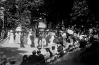 Kronprinsparet, den blivande Gustaf VI Adolf med drottning Louise flankerad av t.v. landshövding Arvid Lidén, t.h. borgmästarinnan Ulla Malmquist. De var på besök i Kalmar i samband med en hantverksmässa.