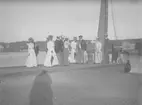Enligt fotografens noteringar: "Grupp, Fru Johnston, Rosa, Frances." Plats: Strandvägen, Gustafsbärg Datum: 12 Juli 1897 Tid: Kl 8.50 e.m. Ljus: Solsken Bländare: No 2 Objektiv: Svenska Express Exponering: Hastighet No: 3 Framkallning: Hydroechinon, Eikonogen Anmärkningar: "Underexponerad och hål i Kameran."