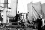 Fotografi från första svenska Antarktisexpeditionen 1901-1904. Motiv av män och hundar ombord på fartyg.